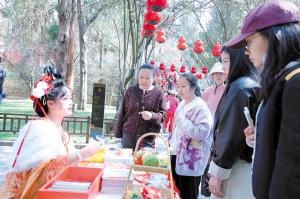 金殿景区内,市民和游客驻足新春市集。记者杨艳辉摄