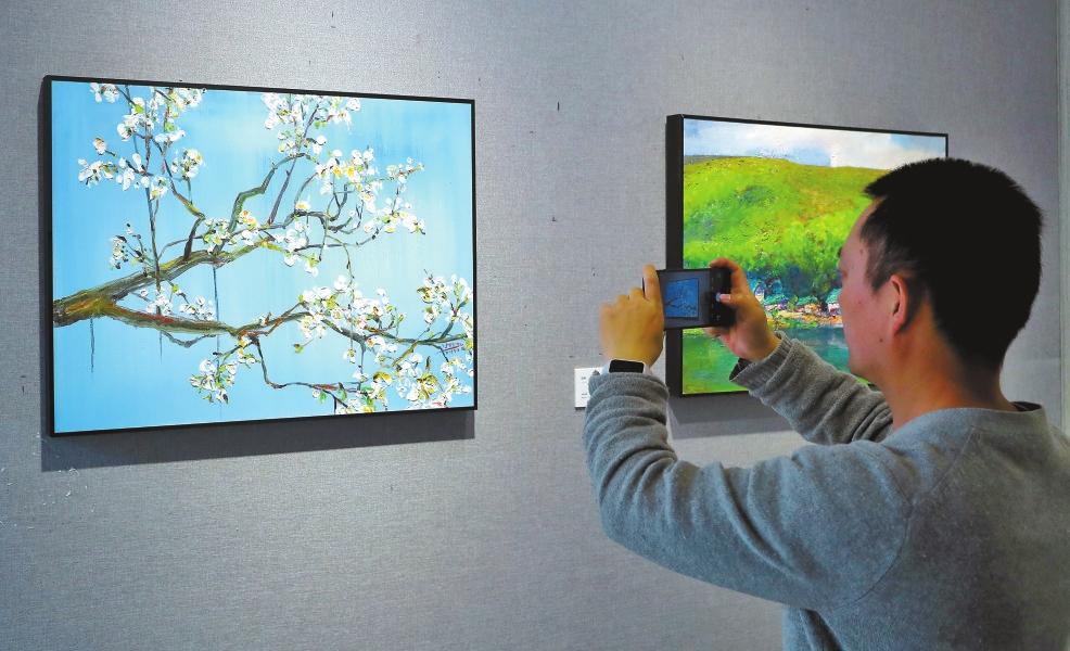 市民在省图书馆参观昆明风景画展。 记者 杨峥 摄