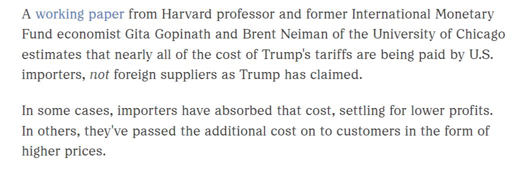 哈佛大学教授、国际货币基金组织前首席经济学家姬塔·戈皮纳特与芝加哥大学的布伦特·尼曼联合撰写的一份报告预计,特朗普政府关税的几乎所有成本都由美国进口商承担,而并非如特朗普所声称的那样由外国供应商承担。在某些情况下,进口商吸收了这部分成本,接受较低的利润;在其他情况下,他们将额外成本以更高的价格转嫁给客户。
