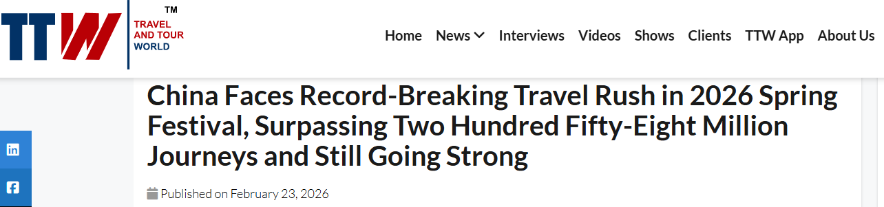 美国《旅行和旅游世界》网站2月23日报道称,2026年中国春运进入返程高峰阶段,出行规模持续扩大,今年春运必将再次书写中国交通发展的新篇章。