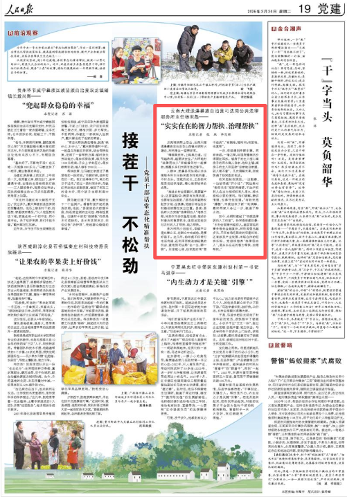 今年中央一号文件首次提出“常态化精准帮扶”,作出一系列部署:健全常态化帮扶政策体系、提高监测帮扶精准性时效性、提升产业和就业帮扶实效、分层分类帮扶欠发达地区…… 从脱贫攻坚战,到5年过渡期,再到常态化精准帮扶,映照一以贯之的初心,彰显久久为功的决心。近日,记者采访多名基层党员干部,倾听他们扎根农村、服务“三农”的故事,请他们谈谈新的一年深耕不辍、接续奋斗的打算。其中,云南大理漾濞彝族自治县司法局公共法律服务所主任杨宋彪如是说:“实实在在的智力帮扶、治理帮扶”。