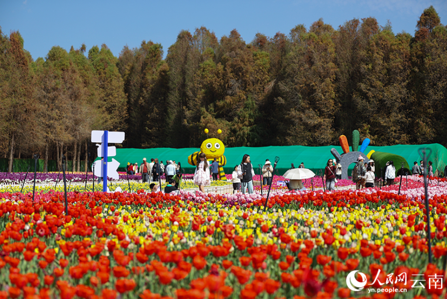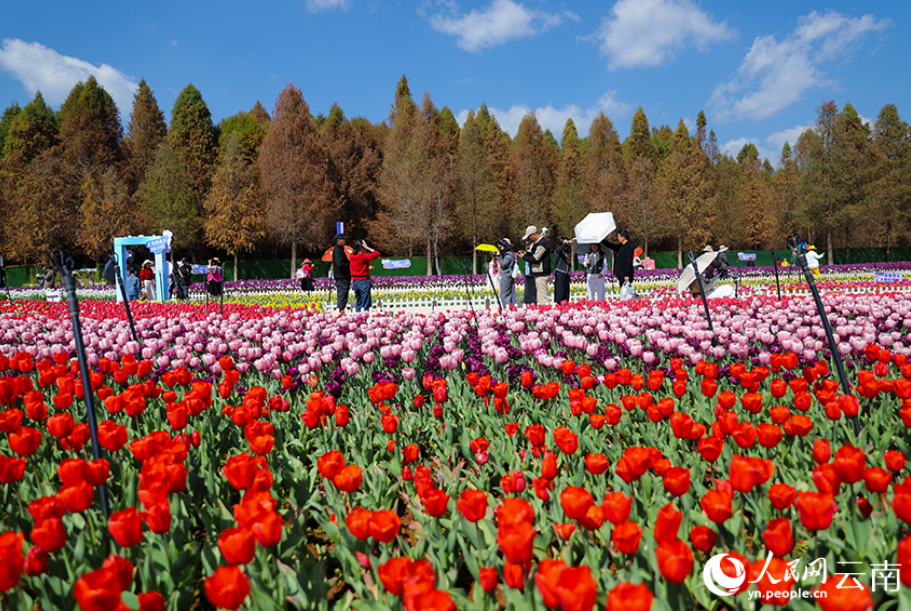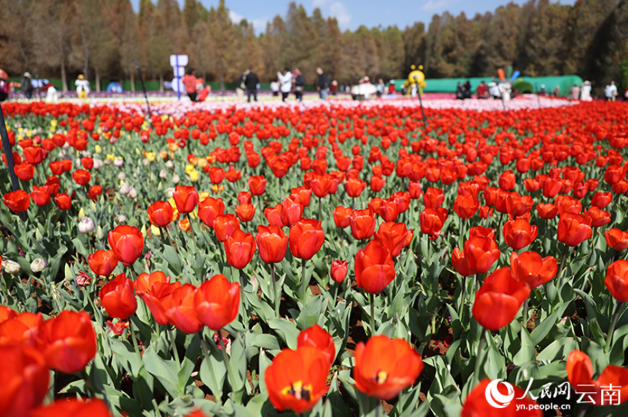 春节期间,云南昆明捞渔河国家湿地公园内百万株郁金香迎来盛花期,红、粉、紫等各色花朵连片绽放,交织成绚丽花海,为新春佳节增添了浓浓春意,成为游客休闲打卡的热门去处。(人民网 记者李发兴)