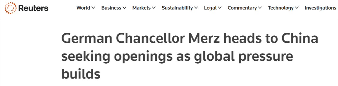 路透社24日的文章说,过去一年,欧洲与美国联盟的瓦解以及供应链的脆弱性暴露无遗,在此背景下,德国总理默茨本周访问中国,成为最新一位试图与中国修复关系的欧洲领导人。