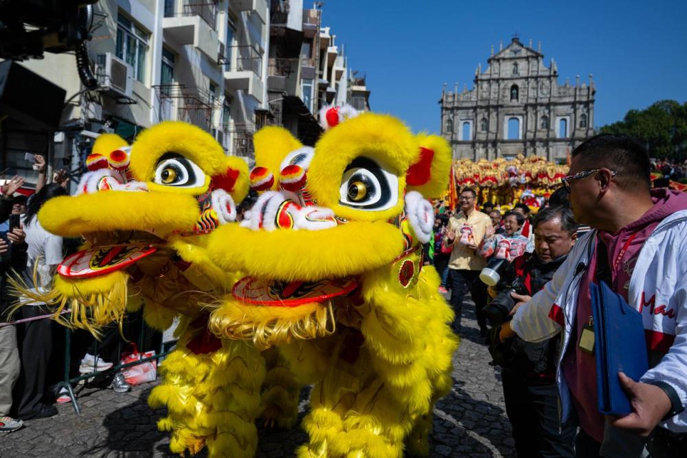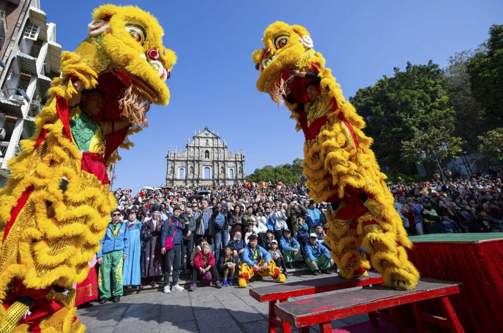 2025年1月29日,忠信体育会舞狮队春节期间在澳门大三巴牌坊前。新华社发(张金加摄)