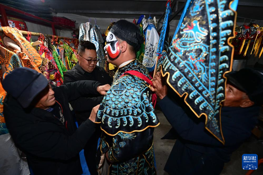 3月2日凌晨,陇县黄花峪村村民为社火队队员穿戴演出服饰。
