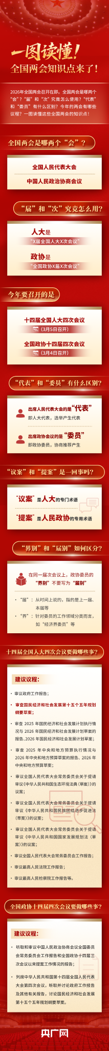 2026年全国两会召开在即。全国两会是哪两个“会”?“届”和“次”究竟怎么使用?“代表”和“委员”有什么区别?今年的两会又有哪些议程?一图读懂这些关于全国两会的知识点!