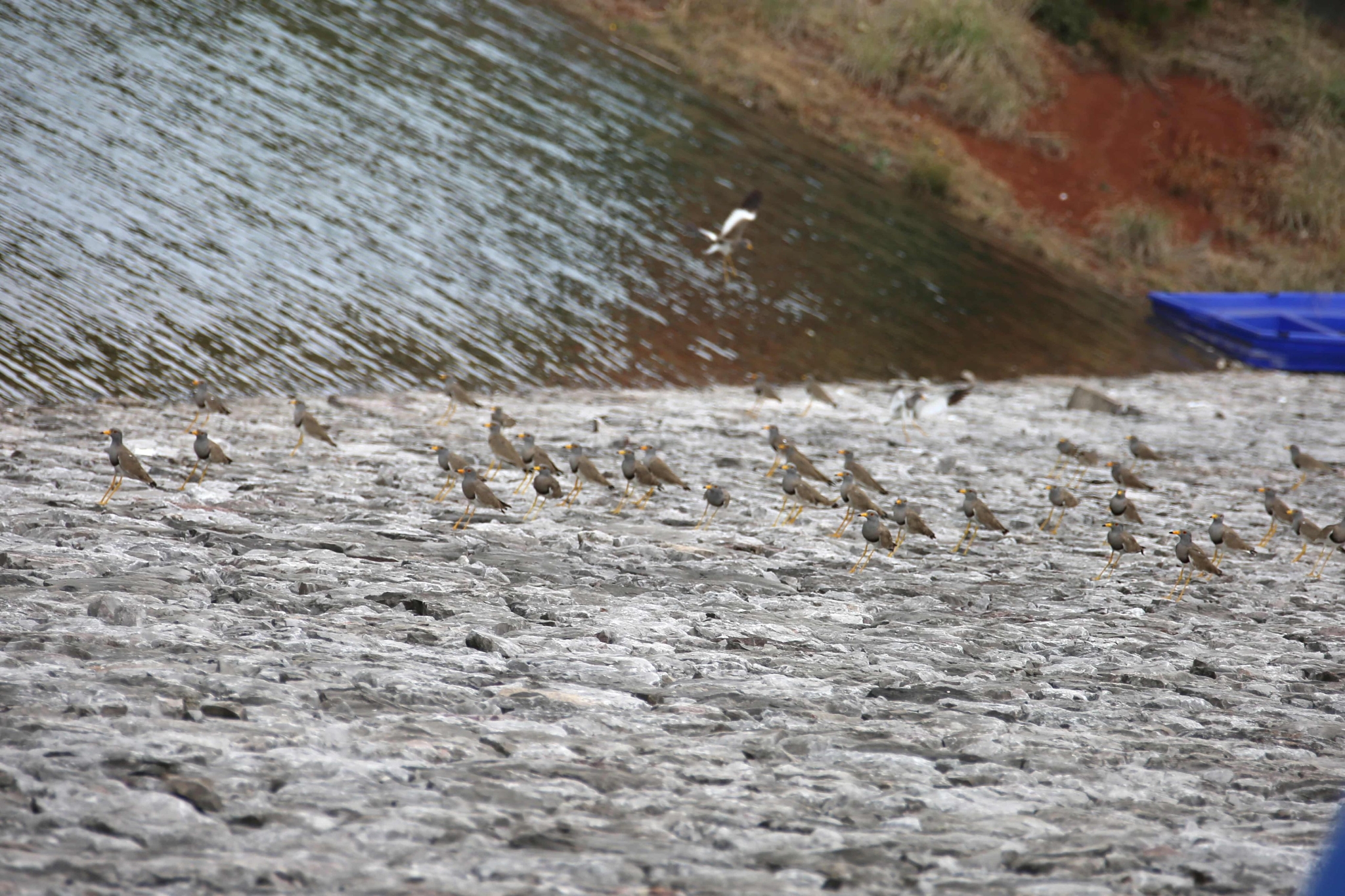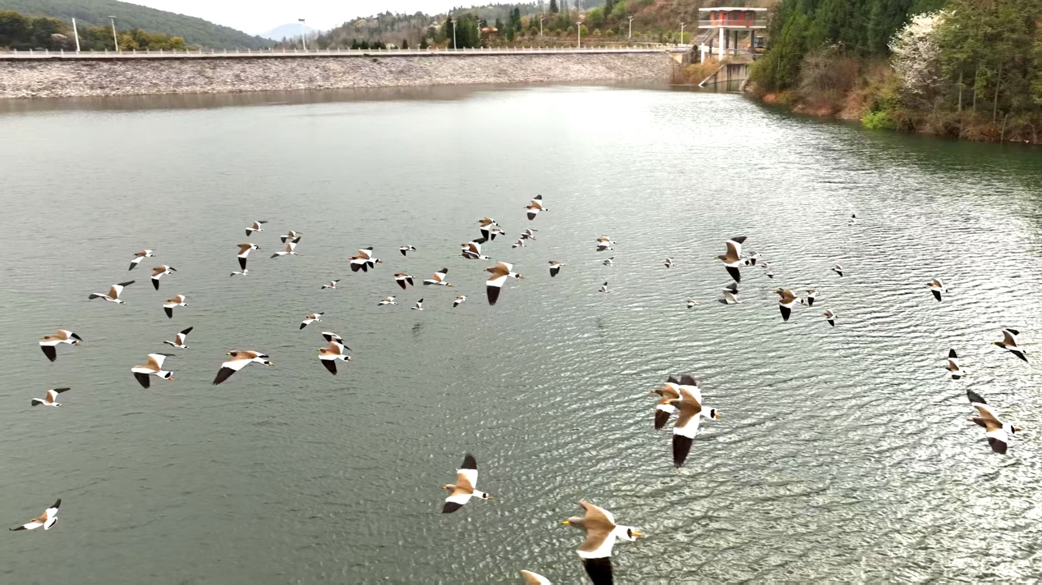 近日,富源县牛耳箐水库迎来100余只灰头麦鸡栖息。记者在现场看到,这些灰头麦鸡在库区及周边区域悠闲踱步,黄嘴黑尖、灰翅白腹,黑白相间的羽毛在阳光下格外醒目。它们时而低头啄食,时而振翅低飞,清脆鸣叫声回荡水间。