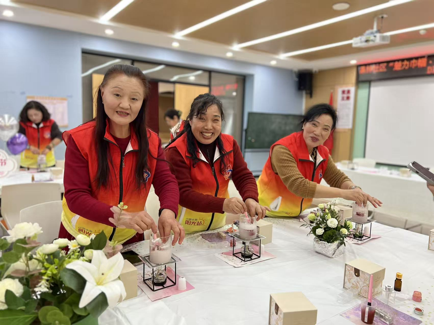 阳春三月,暖意融融。八公里社区妇联组织开展“‘手’护芳华 DIY你的专属味道”三八国际妇女节护手霜DIY活动。社区兼职委员会成员单位代表、辖区企业云聚物流妇女代表、物业女性职工代表及居民代表欢聚一堂。活动现场设置了芳华悦己打卡点和鲜花领取小铺,在轻柔的音乐中,大家沉浸式体验节日的快乐。在专业指导下,姐妹们认真配比天然油脂、保湿剂和精油,一步步将原料变成温润清香的专属护手霜。活动之余,社区还链接经开区税务局资源,现场答疑社保及税收政策问题,将节日关怀与实用服务送到女性身边。
