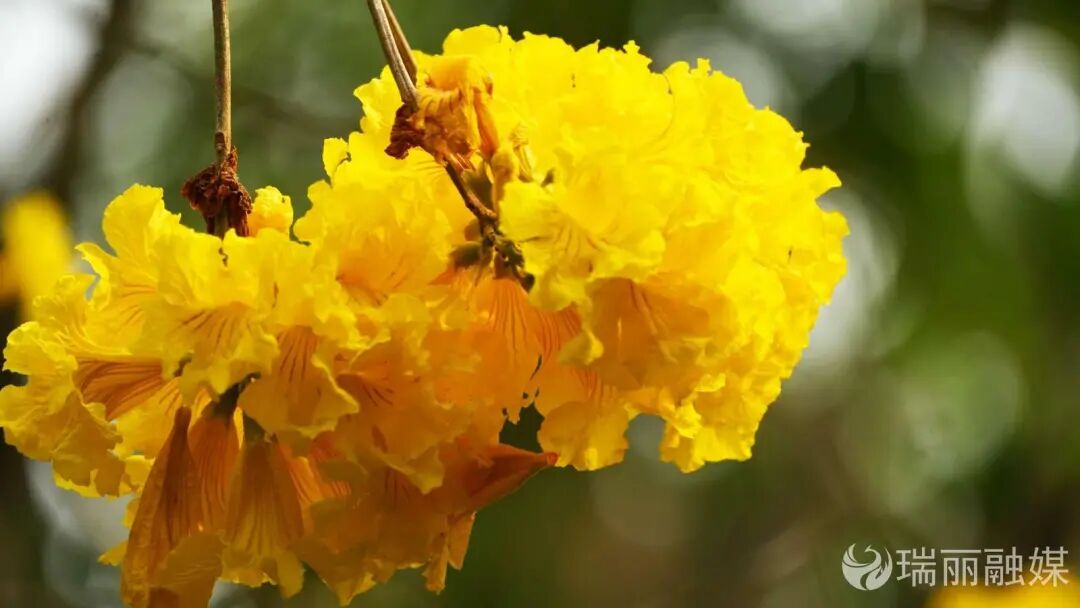 黄花风铃木又名黄钟木,先花后叶,漏斗状花冠簇生枝头,形似风铃,在暖阳下流光溢彩。眼下正值最佳观赏期,枝头无叶、繁花满冠,远观如金色云霞铺展,近看风铃轻垂、随风轻摇,宛若奏响春日序曲。金黄花簇与瑞丽的蓝天、傣寨风情、边境烟火相融,一步一景,皆是诗意。