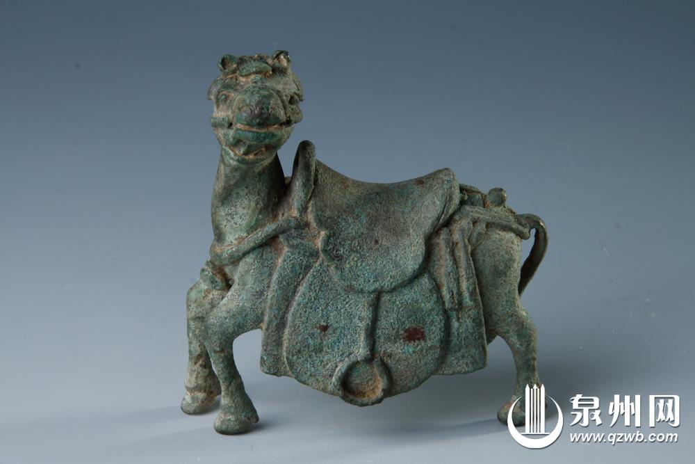 海交馆收藏的一尊明代铜马,高12.4厘米,为国家三级文物。它以青铜铸造而成,通体青绿色,整体造型朴拙厚重,刀法简练。细看之下,这尊铜马呈昂首前行之姿,头部微抬、双目圆睁,口鼻间有缰绳系挂,鬃毛以简洁线条勾勒,神态生动之余颇有几分喜感。马身佩戴鞍鞯,高耸的鞍桥、垂落的障泥相映成趣,纹饰清晰可辨;其前腿微屈,后腿蹬地,四足踏于地面,姿态矫健而不失沉稳。