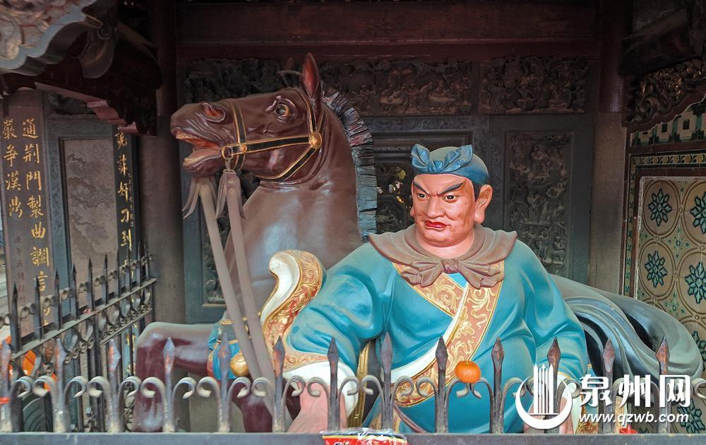 泉州通淮关岳庙门前的两匹神驹塑像,一匹为关羽的赤兔火龙,一匹为岳飞的雪青骐骥,两尊塑像与身旁的马军公造像相映成趣,在马年迎来众多游客驻足观赏。