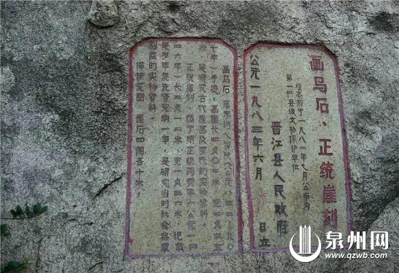 与画马石相伴的,还有一方明朝正统十二年(1447年)的摩崖石刻。这方石刻长2.12米、宽1.36米,以楷书竖排,记载了当时当地遭遇灾荒、里长林良吉先贷完纳秋禾赋税的事迹,为研究明代社会典章制度提供了珍贵的实物佐证。如今,画马石与正统崖刻均被列为晋江市文物保护单位,既点缀着山川风光,也丰富了泉州的文化遗产。