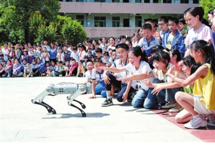 四川省通江县至诚镇光辉希望小学学生观看机器狗表演。资料图片