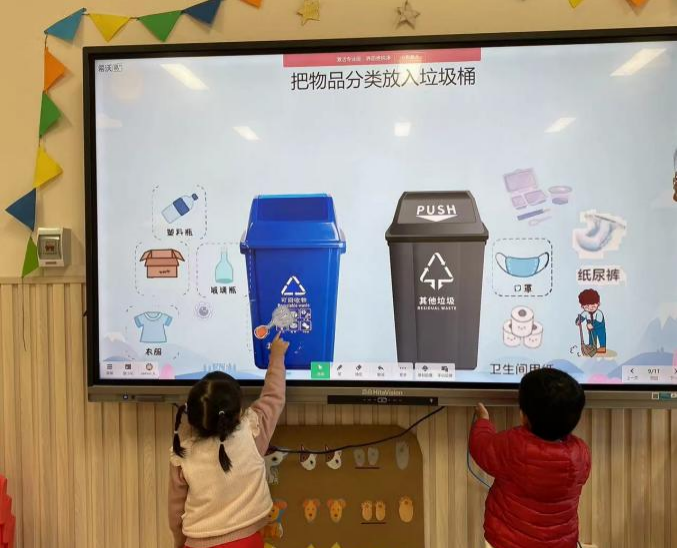 活动上,老师们结合幼儿的年龄特点和认知规律,摒弃枯燥的说教,采用趣味动画、实物教具展示、情景模拟等直观易懂的形式,向孩子们生动讲解了垃圾分类的重要意义。从可回收物的循环利用、厨余垃圾的资源化处理,到有害垃圾的危害与正确投放、其他垃圾的妥善处置,老师们细致拆解分类标准、区分技巧和投放要求,将抽象的环保知识转化为孩子们能理解、能记住的生活常识。课堂上,孩子们听得聚精会神,积极举手发言,主动分享自己在生活中看到的垃圾分类场景,你一言我一语,现场氛围热烈而活泼,充分展现了孩子们的求知欲和参与热情。