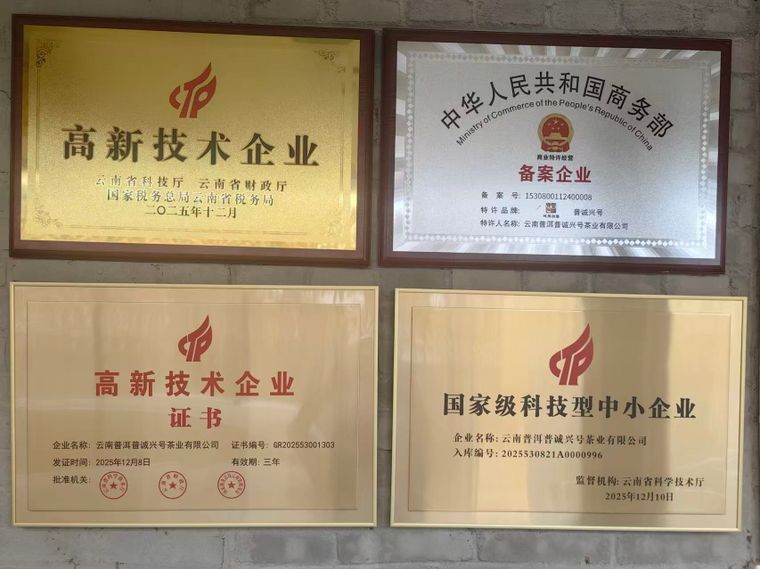 说起这些荣誉的获得,云南普洱普诚兴号茶业有限公司负责人邓华龙介绍,高新技术企业认定以“核心自主知识产权、科技成果转化能力、研发组织管理水平”为核心评审维度,标准严苛、流程严密,是对企业创新硬实力的权威检验,也是百年老字号[普诚兴号]深耕茶业的实力佐证。“高新技术企业”是国家为扶持和鼓励高新技术领域发展,调整产业结构和提升国家经济竞争力而设立的国家级资质认证。其认定门槛高、标准严,围绕核心自主知识产权、技术研发水平、科技成果转化能力、研发组织管理水平、成长性指标等多个维度进行综合评估,是对企业科技创新能力的全方位“体检”与最高肯定。