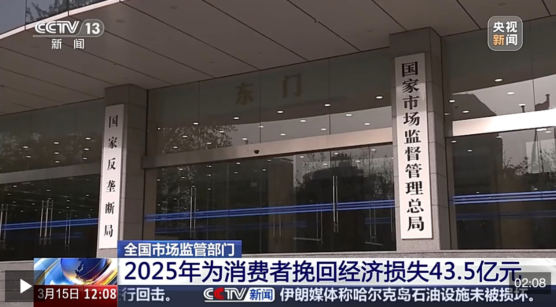 记者今天(15日)从市场监管总局了解到,2025年,全国市场监管部门通过全国12315平台、电话等渠道共受理消费者投诉、举报和咨询4386.6万件,为消费者挽回经济损失43.5亿元,有力保护了消费者合法权益。