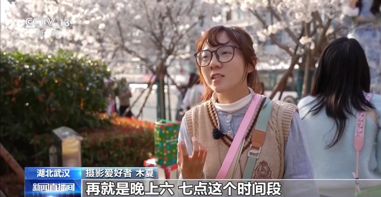 作为武汉首条樱花商业街区,光谷步行街是年轻人的赏樱主场。这附近有多所高校,有不少学生到这里打卡拍照。