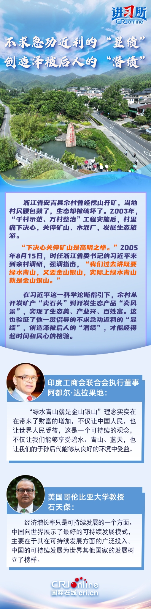 政绩为谁而树、树什么样的政绩、靠什么树政绩,习近平以数十年的躬身实践给出了答案:在河北正定,宁可不要“全国高产县”这个桂冠,也要为当地农民减负;在福州,亲自主持编制了《福州市20年经济社会发展战略设想》;在浙江,提出“两山”理念,让好环境成了乡亲们的“聚宝盆”……