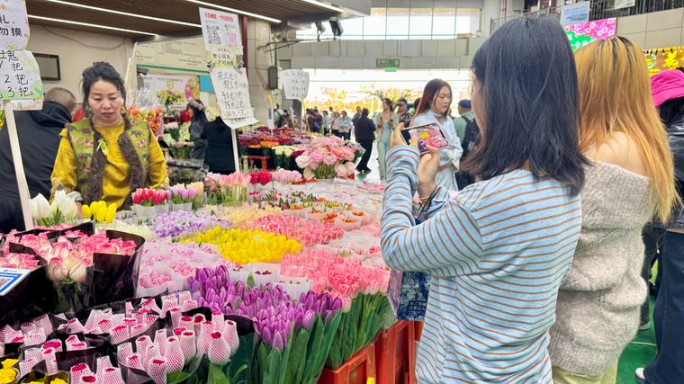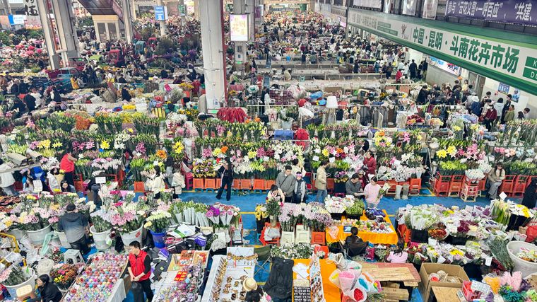 斗南花卉市场内热闹非凡,众多市民和游客到此选购鲜花,感受专属昆明的花式浪漫。记者上官艳君 摄