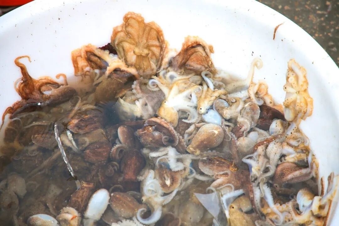 老渔民明纪进端着刚分拣出的扣纽子热情招呼:“新鲜的!炖豆腐、炒韭菜都鲜掉眉毛,实惠得很!”相较于风蛸和皮皮虾,扣纽子的价格更实惠一些,当日市场价在25~30元/斤之间。