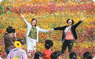 游客在云南省西双版纳傣族自治州景洪市曼沙村赏花游玩。李云生摄(人民图片)