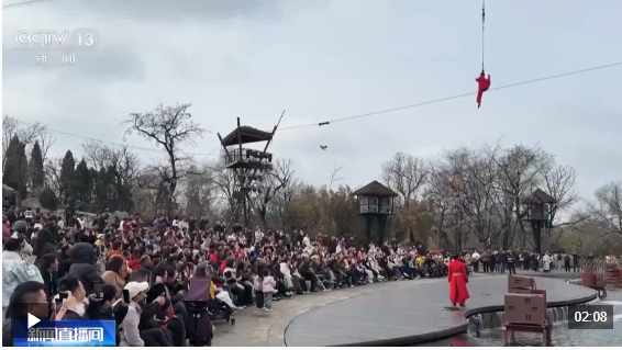 在河南开封的万岁山武侠城景区,穿着戏服在台上断案的并不是演员,而是现场选取的游客。在这里,从街头到巷尾,风格各异的演员带着游客猜拳、破案、比武功,甚至一起走入剧情演绎角色。通过参与互动,游客还能赚取“银票”在景区购物,沉浸体验古代市井生活。景区里战马奔腾、云梯攻城等实景演出轮番上演。