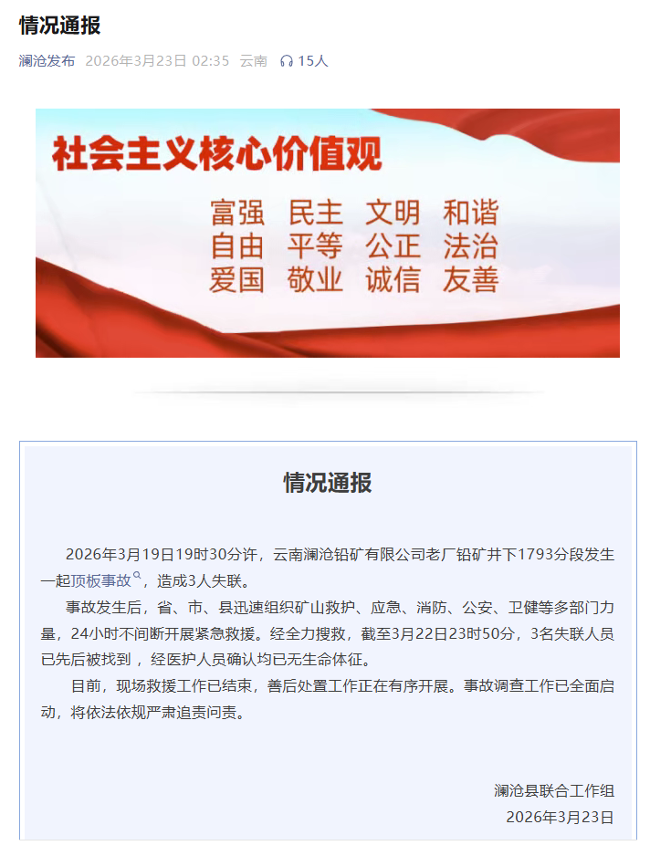 通报显示,2026年3月19日19时30分左右,云南澜沧铅矿有限公司老厂铅矿井下1793分段发生顶板事故,事故发生后有3名人员失联。