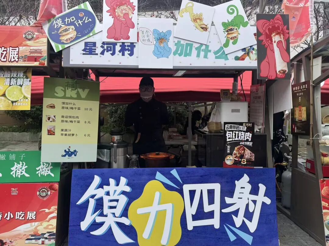 在这片美食江湖里,其中一家挂着“红烧肉烧饵块”招牌的摊位格外引人注目。这道创新小吃来自于北京知名的餐饮品牌星河村,摊主杜双将“美团北京创意菜好评榜第一名”的口碑美食带到了巍山小吃节。