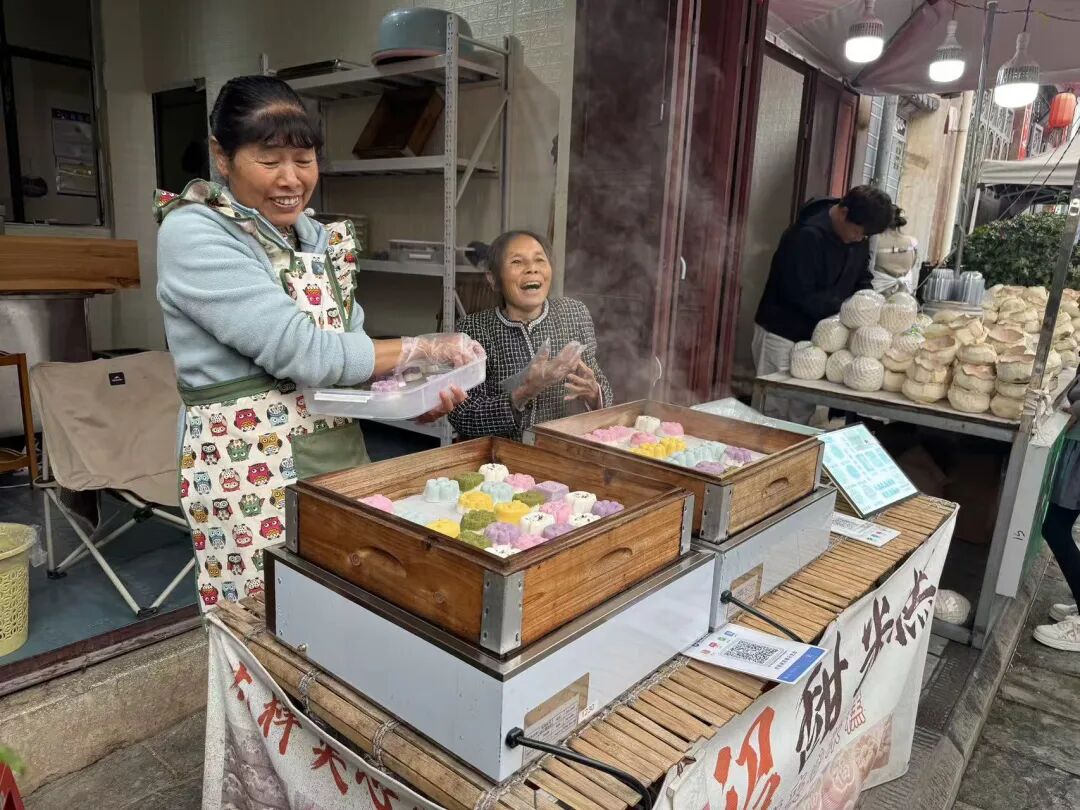 放眼望去,小吃街两侧摊位有序排列,青豆小糕、烤蚕豆、牛干巴、巍山蜜饯等上百种特色小吃一字排开,每一家都排着长长的队伍,每一种小吃都藏着巍山地道老味道。摊主一边忙碌制作,一边热情招呼,吆喝声与食物的香气交织在一起,构成了最动人的古城烟火图。街道上,游客边走边吃、拍照打卡,处处洋溢着热闹欢快的氛围。