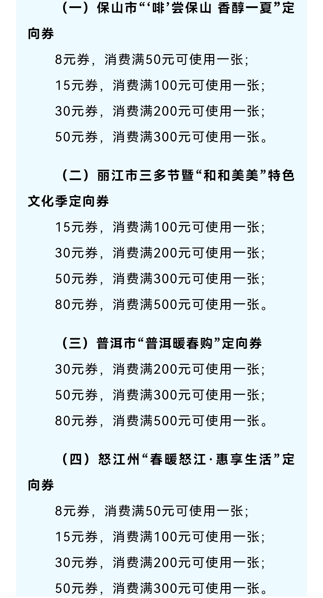 此次彩云美物消费券将推出保山市“‘啡’尝保山 香醇一夏”定向券,丽江市三多节暨“和和美美”特色文化季定向券,普洱市“普洱暖春购”定向券,怒江州“春暖怒江·惠享生活”定向券。发放对象为手机定位在云南省保山市、丽江市、普洱市、怒江州的消费者。