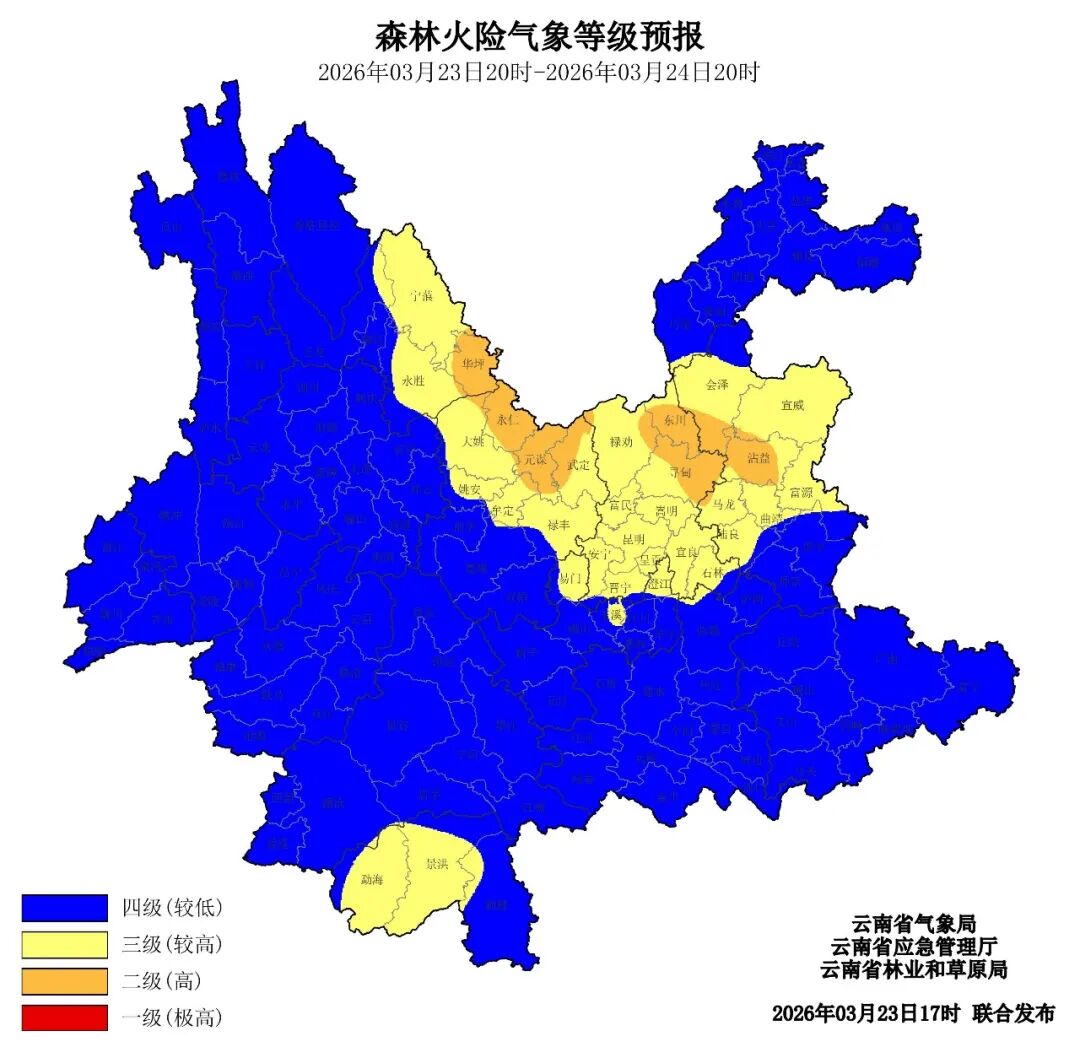 2026年3月23日20时至3月24日20时,丽江市东部、楚雄州北部、昆明市东北部、曲靖市西北部二级(高),丽江市中东部、西双版纳州中部和西部、楚雄州中北部、昆明市大部、玉溪市北部、曲靖市北部和中部三级(较高),其他地区四级(较低)。