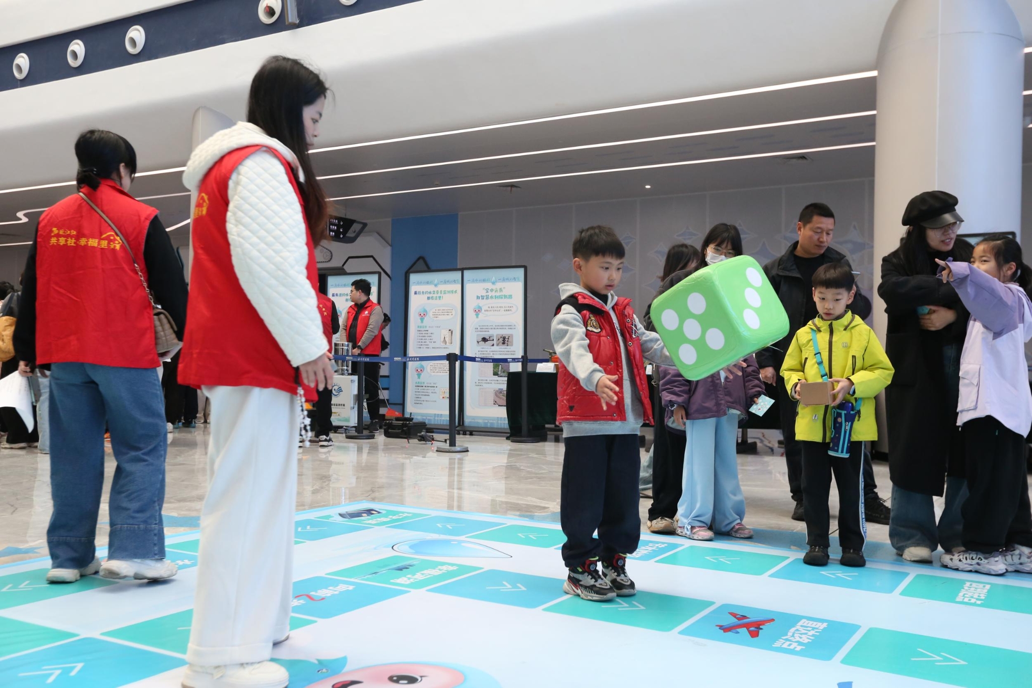 互动游戏体验区是当天现场最热门的区域,活动巧妙将水利知识与传统游园项目相结合,精心设置了水的旅程拼图挑战、小小节水家实操、河湖保卫战套圈、幸福河湖大富翁、水动力挑战等五大趣味游戏。河湖保卫战套圈项目的桩桶上清晰标注着温州本土河流名称,孩子们一边兴致勃勃套圈,一边认真认读九龙河、戍浦江、会昌河等熟悉的幸福河;拼图区里,孩子们通过拼接温州主要河湖水系图,慢慢勾勒出家乡“水网密布、河湖相连”的地理轮廓,在玩乐中加深对家乡水情的了解。