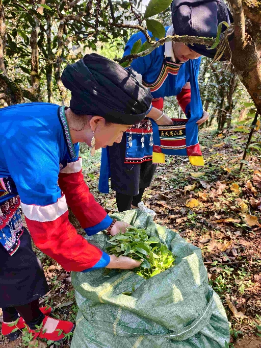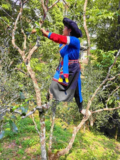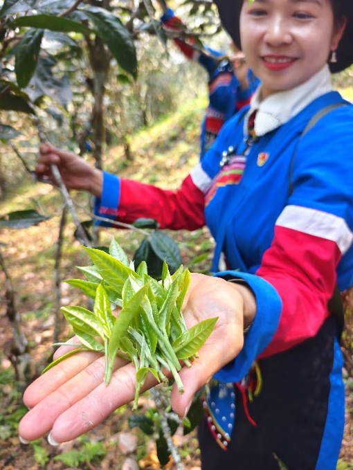 清晨的高山村古茶园,阳光穿透林间薄雾,洒在苍劲的古茶树上。一颗颗粉红色的宫粉羊蹄甲(一种西双版纳特有的观花乔木,3月正是盛花期)在山风中摇曳着春天的味道。身着彝族传统服饰的茶农们灵巧地穿梭于大山深处、古茶树间,或攀上古树枝头,或探身采摘茶树梢的嫩芽。一旁,彝族老人唱着致富奔小康的新山歌助兴。指尖翻飞间,一芽一叶的鲜叶被轻轻摘下,随身背着的小竹篓很快便盛满了春日的清香。记者也亲手体验了采茶的过程,才深知“明前茶贵如金”的背后,是茶农们日复一日的辛劳与坚守。