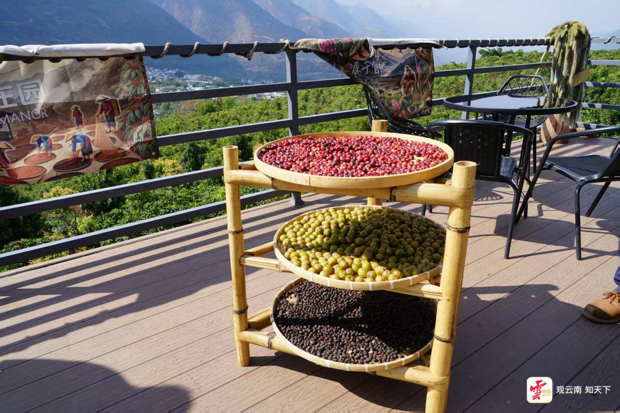 贡江咖啡庄园晾晒的咖啡豆和滇橄榄