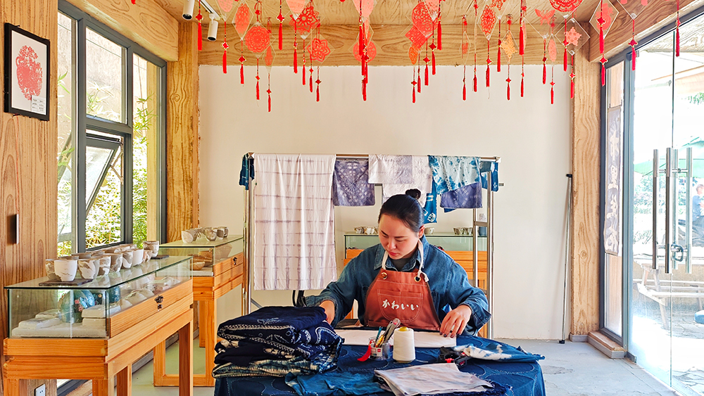 旅居客在弥渡县红岩镇白崖古城村体验扎染手工技艺。杨文虹/摄