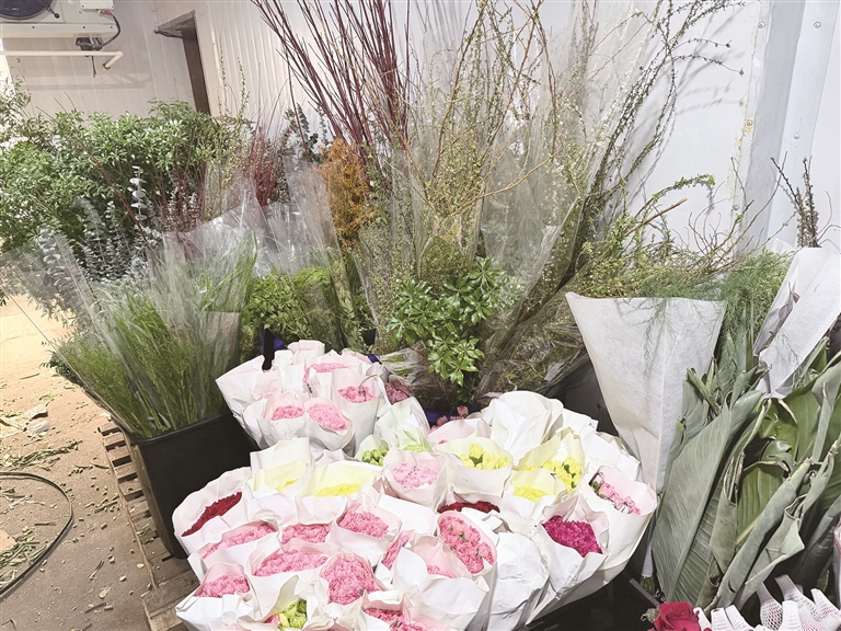 清晨八点半,拉萨市城关区团结新村巷子内的和美花卉小居,运送鲜花的货车停在门口,店主小跑着卸货。一捆捆玫瑰、百合、康乃馨被搬进店里,修剪、去刺、插桶,整个过程行云流水。空气里混杂着潮湿的泥土味和隐隐的花香,这是春日清晨特有的气息。