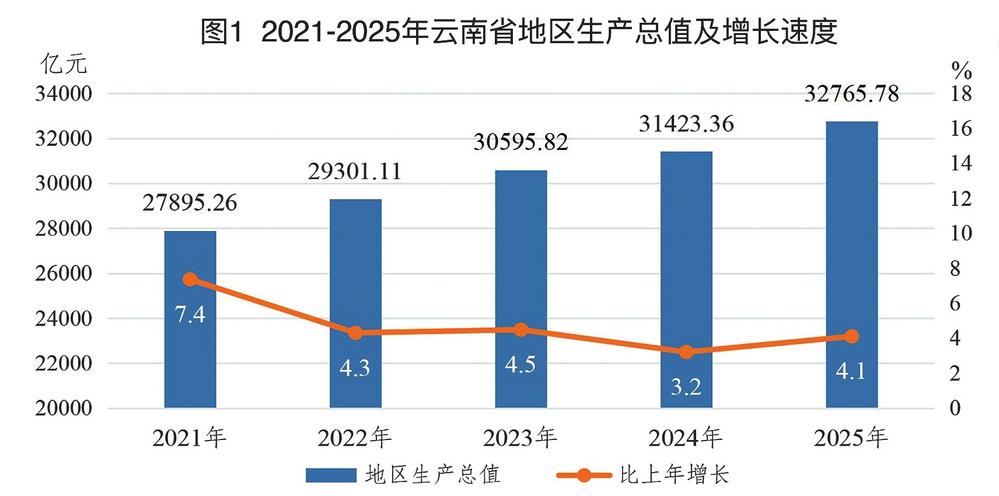 根据地区生产总值统一核算初步结果,2025年云南地区生产总值[2]32765.78亿元,比上年增长4.1%。其中,第一产业增加值4320.77亿元,增长3.1%;第二产业增加值10500.61亿元,增长2.9%;第三产业增加值17944.40亿元,增长5.1%。三次产业对经济增长的贡献率分别为10.6%、22.1%、67.3%。三次产业结构为13.2∶32.0∶54.8。全省人均地区生产总值70472元,增长4.5%。全员劳动生产率[3]11.72万元/人,比上年提高4.9%。