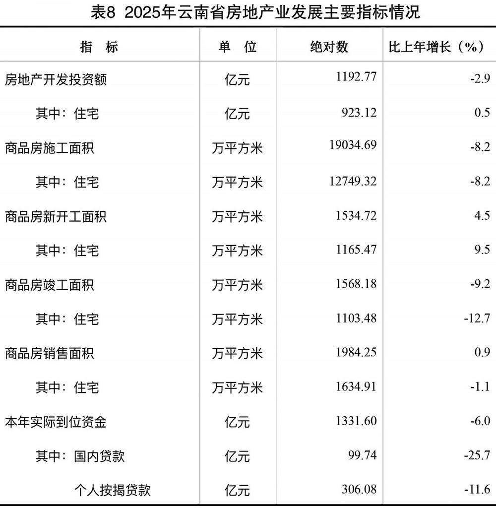 表8 2025年云南省房地产业发展主要指标情况