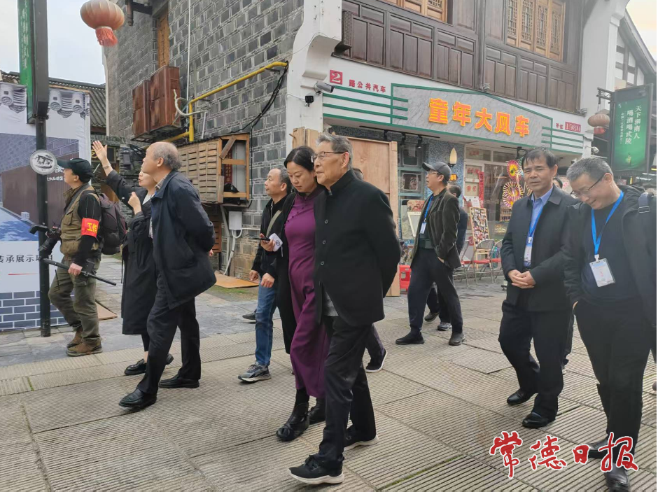 傍晚时分,嘉宾们走进常德河街。这条复刻清末民初街巷繁华景象的古街被誉为常德的“清明上河图”,既保留古色古香的建筑风貌,又弥漫浓郁的人间烟火气。漫步青石板路,嘉宾们欣赏古街风情,品尝特色小吃,有的曲家还现场体验了以棒为杵细细捣制擂茶之乐。中华诗词学会散曲工委顾问、湖南省诗词协会会长蔡建和当即写下了《【正宫·塞鸿秋】常德擂茶》:“芝麻豆子农家荟,钵擂杵捣山泉兑。长壶斟满娇娘媚,大盆管够游人醉。闻来扑鼻香,畅饮驱寒胃,难忘这武陵纯厚浓情味。”让大家赞不绝口。