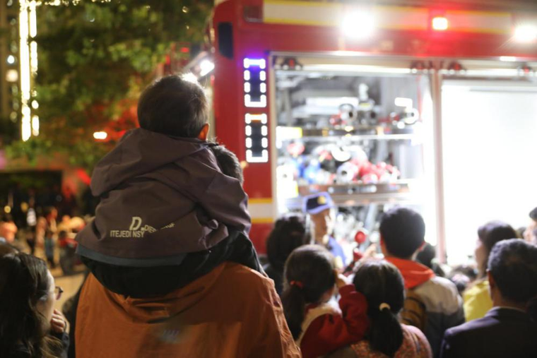 活动临近结束,消防员现场开起了“装备小课堂”,邀请在场的居民们近距离参观消防车的“百宝箱”,现场讲解了液压钳、探测仪、高压水枪等器材的用途。现场的小朋友们,在消防员的讲解下目不转睛地看着琳琅满目的器材,争先试戴消防头盔,沉浸式体验了一把“消防员”的感觉。