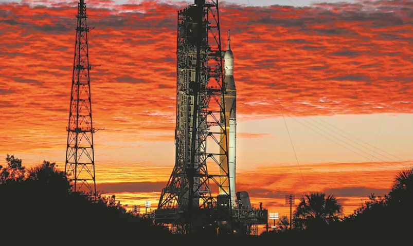 太空发射系统(SLS)火箭位于美国佛罗里达州NASA肯尼迪航天中心发射台上,“阿耳忒弥斯二号”的“猎户座”飞船在火箭顶部。图片来源:NASA官网