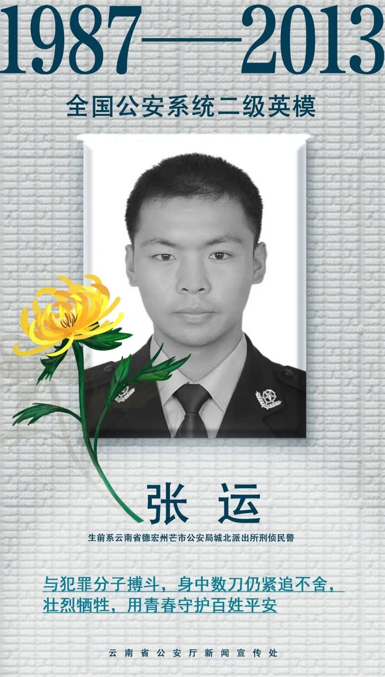 张运,德宏州芒市公安局城北派出所刑侦民警,全国公安系统二级英模。2013 年与犯罪分子搏斗,身中数刀仍紧追不舍,用青春守护百姓平安。