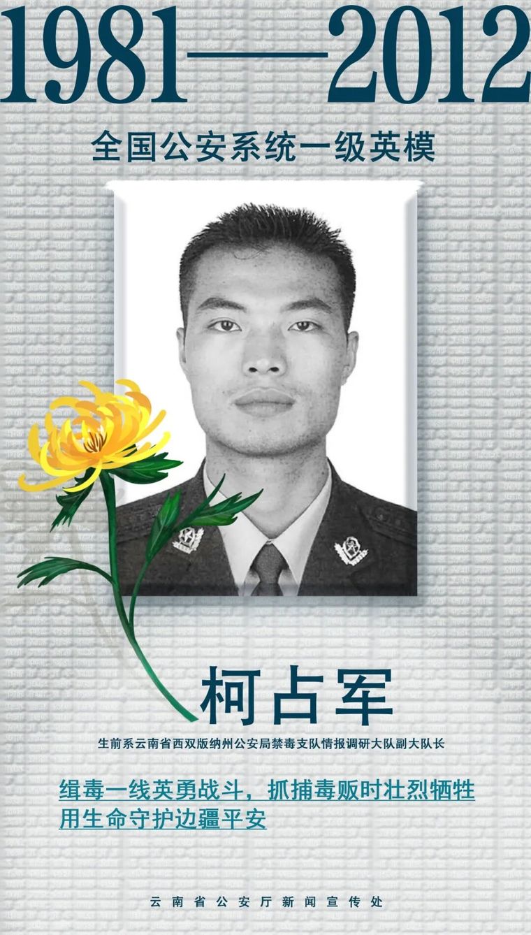 柯占军,西双版纳州公安局禁毒支队情报调研大队副大队长,全国公安系统一级英模。2012 年在缉毒一线抓捕毒贩时英勇战斗,壮烈牺牲。