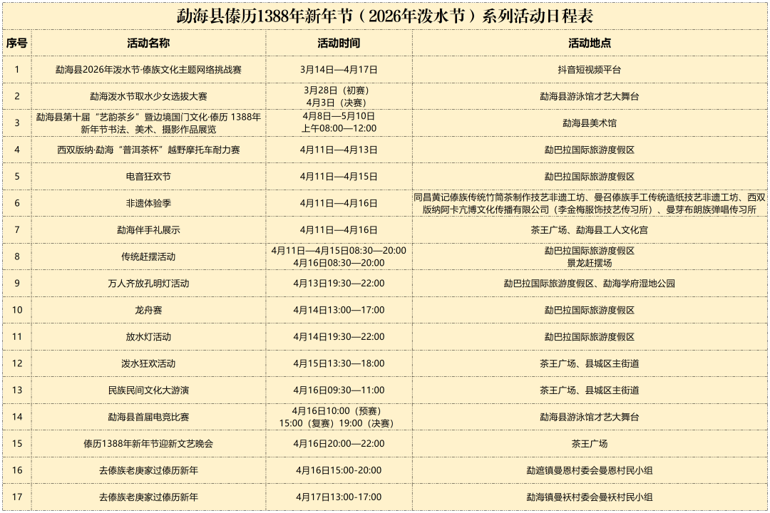 民族节日传统文化体验:4月15日沙河乡,4月16日勐勐镇,4月17日勐库镇,4月18日沙河乡。地点:沙河乡允俸社区忙孝一组、景亢组,勐勐镇闷乐村闷乐组,勐库镇城子社区城子自然村。内容:百家宴活动。