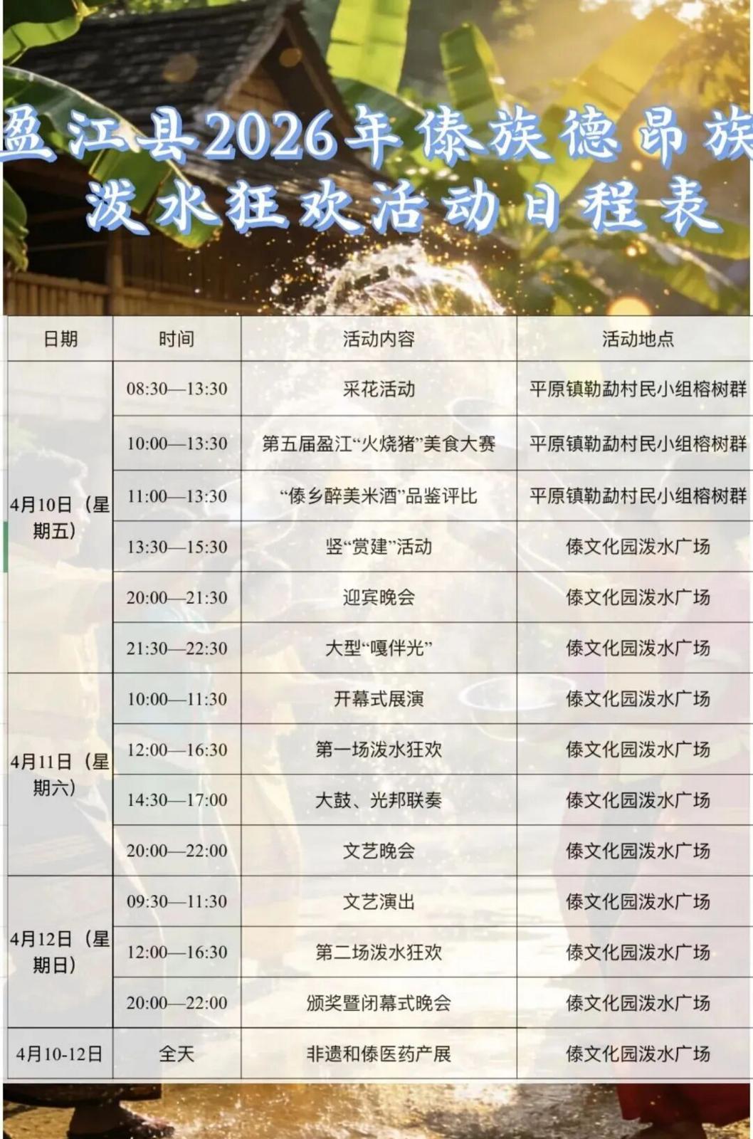 团拜暨万人泼水狂欢活动:4月15日11:00—17:00,县民族文化广场。