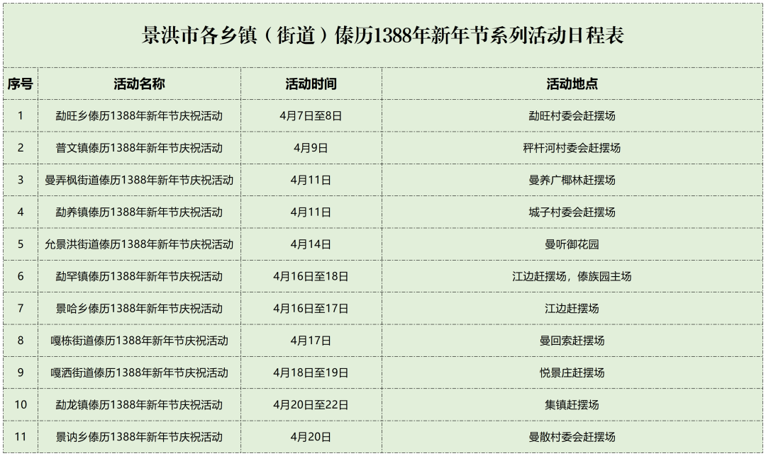 民族节日传统文化体验:4月15日沙河乡,4月16日勐勐镇,4月17日勐库镇,4月18日沙河乡。地点:沙河乡允俸社区忙孝一组、景亢组,勐勐镇闷乐村闷乐组,勐库镇城子社区城子自然村。内容:百家宴活动。