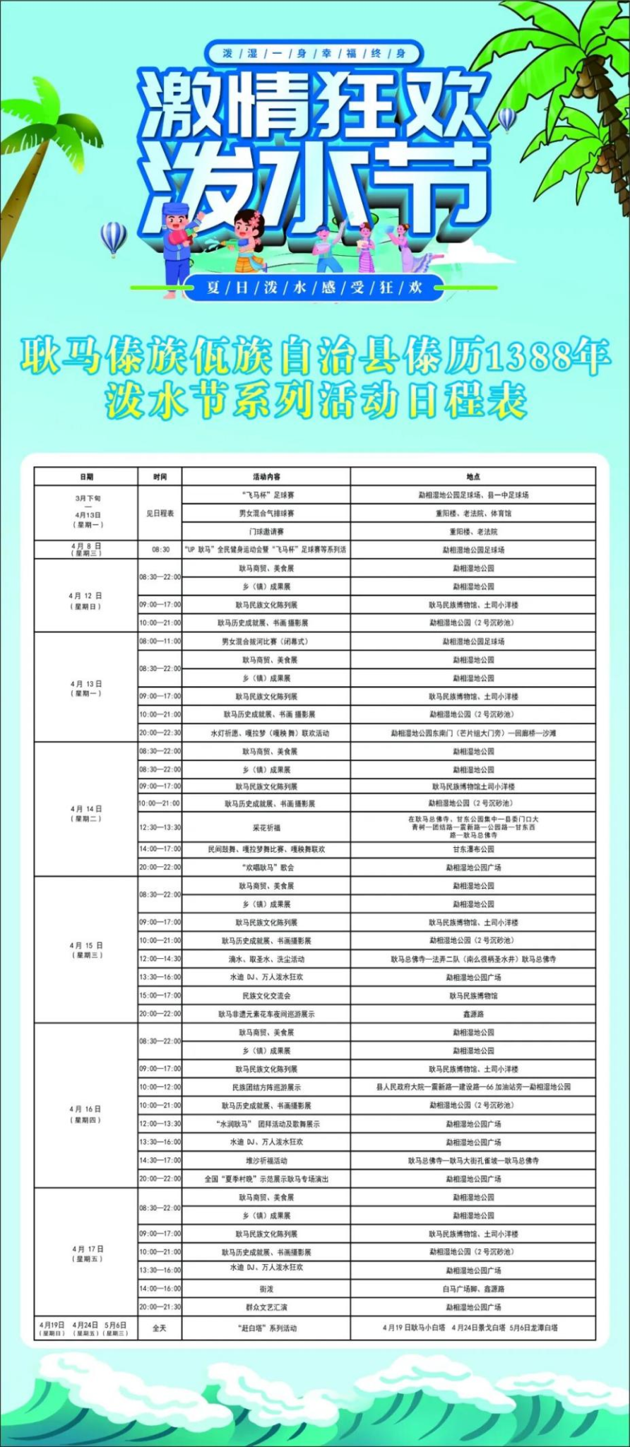团拜暨万人泼水狂欢活动:4月15日11:00—17:00,县民族文化广场。