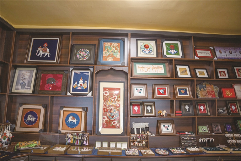 一旁的展示台上,各类配饰与胸针错落摆放、琳琅满目。东侧墙面上,唐卡、服饰与各式文创产品相映成趣。巴桑德吉告诉记者,拉萨“堆绣”唐卡作为国家级非遗项目,以堆、贴、绣、嵌为核心工艺,融合多种刺绣技法,用料考究、工序繁复,是西藏极具代表性的文化瑰宝。为守住技艺的原汁原味,团队始终坚持纯手工制作、不批量生产、不追求速度,实行朝九晚六、无硬性任务的工作模式,杜绝因赶工影响作品质量。凭借扎实手艺与独特文化内涵,产品深受消费者青睐。