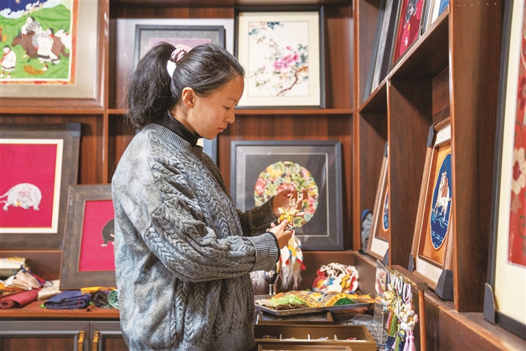 早上9点半,罗布的女儿巴桑德吉准时坐在工作台前,起稿、裁剪、堆贴、绣制……一枚枚精巧雅致的“堆绣”胸针,在她指尖慢慢成型。在日复一日的专注与坚守中,这位年轻传承人,正用创新与热爱,让古老的传统手艺焕发新生。