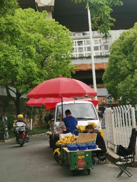 4月8日下午,记者在西苑立交桥下及周边辅道区域看到,大量流动摊贩以面包车、小货车、三轮车为载体,直接占用机动车道、人行便道开展经营,形成连片“马路市场”。桥洞下,货车满载西瓜、菠萝等水果,货品直接堆放在路面,挤占桥洞通行空间;辅道上,有面包车打开后备箱售卖西瓜、枇杷,三轮车摆摊售卖蓝莓等鲜果,红色遮阳伞撑开在车道内,过往电动车、摩托车只能借道绕行,行人与摊位、车辆混行,早晚高峰极易引发拥堵,存在安全隐患。